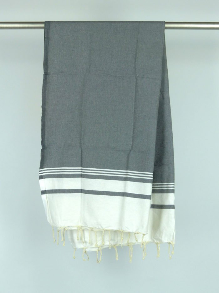 Fouta tissage à plat gris moyen rayures blanches 1m x 2m. Fouta traditionnelle 100% coton finition manuelle.
